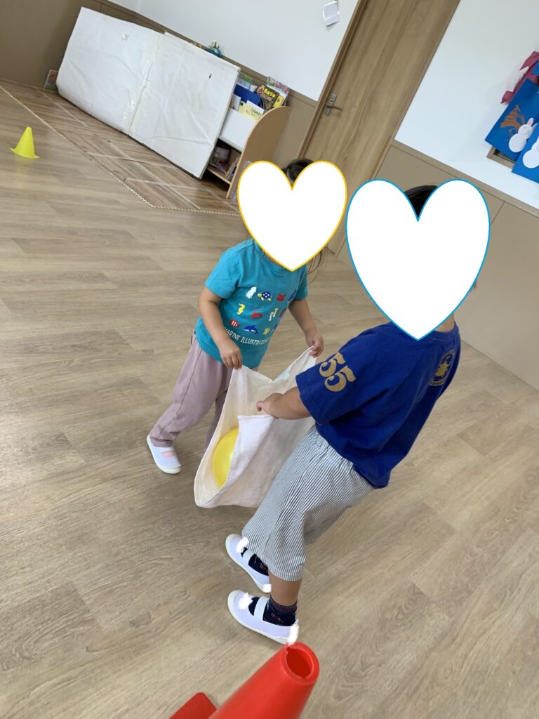 お友達と二人でタオルを持って運ぶことにも挑戦!