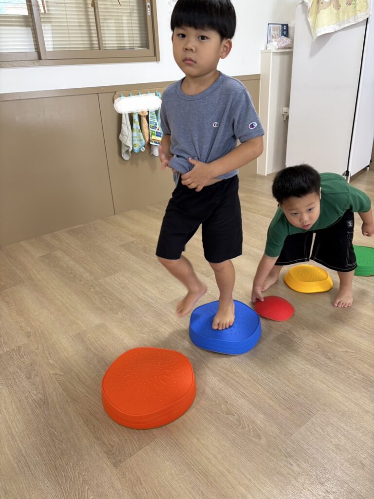 平均台や飛び石は落ちないように進むように伝えると・・・意識する姿がみられましたよ👏
