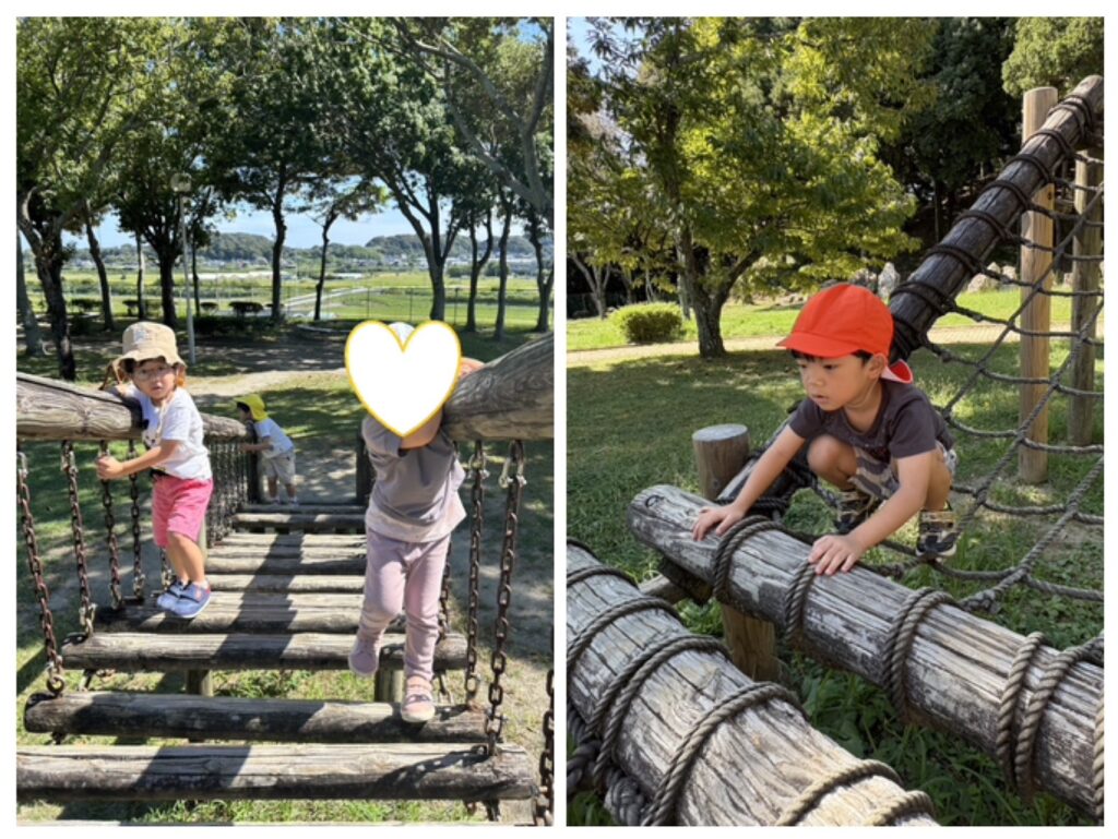 揺れる丸太やロープのアスレチックを慎重に上って行くと・・・途中恐くなってしまった子もいましたが職員が見守る中一番上まで行くことが出来ました👏