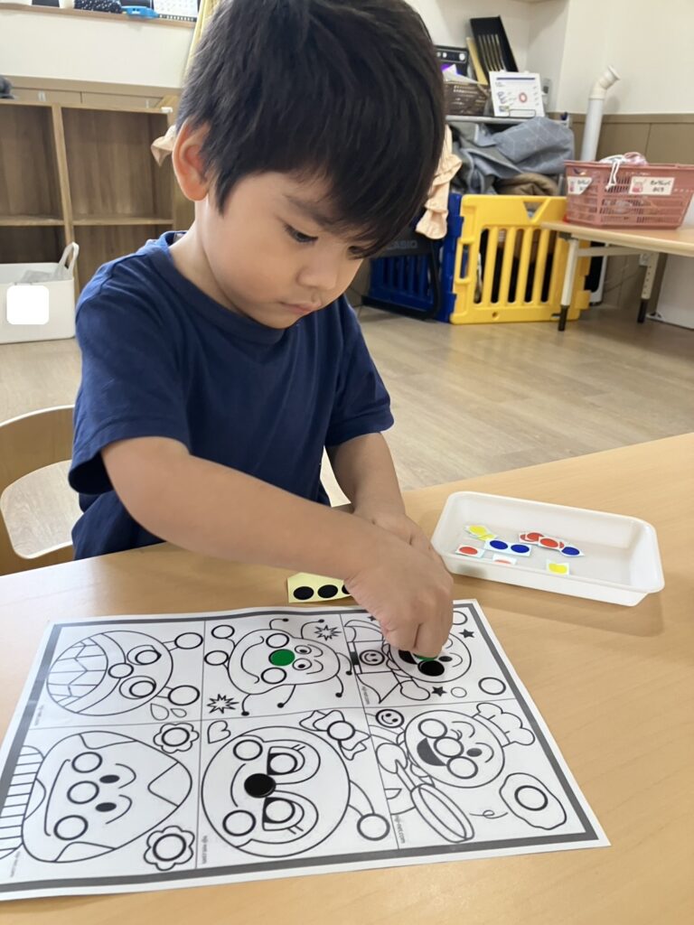 4色の丸にカラーシールを貼ったり、アンパンマンのイラストにシールを貼ったり・・・