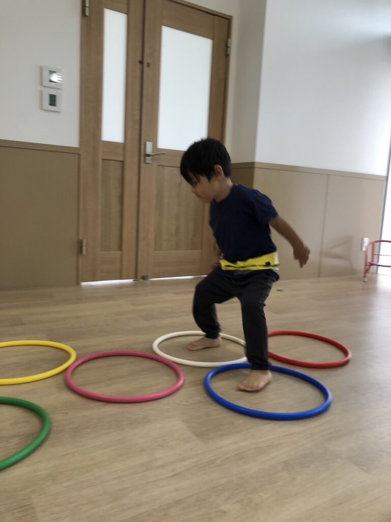 平均台をスタスタと進み、フープは踏まないように跨いだりジャンプしたり・・・