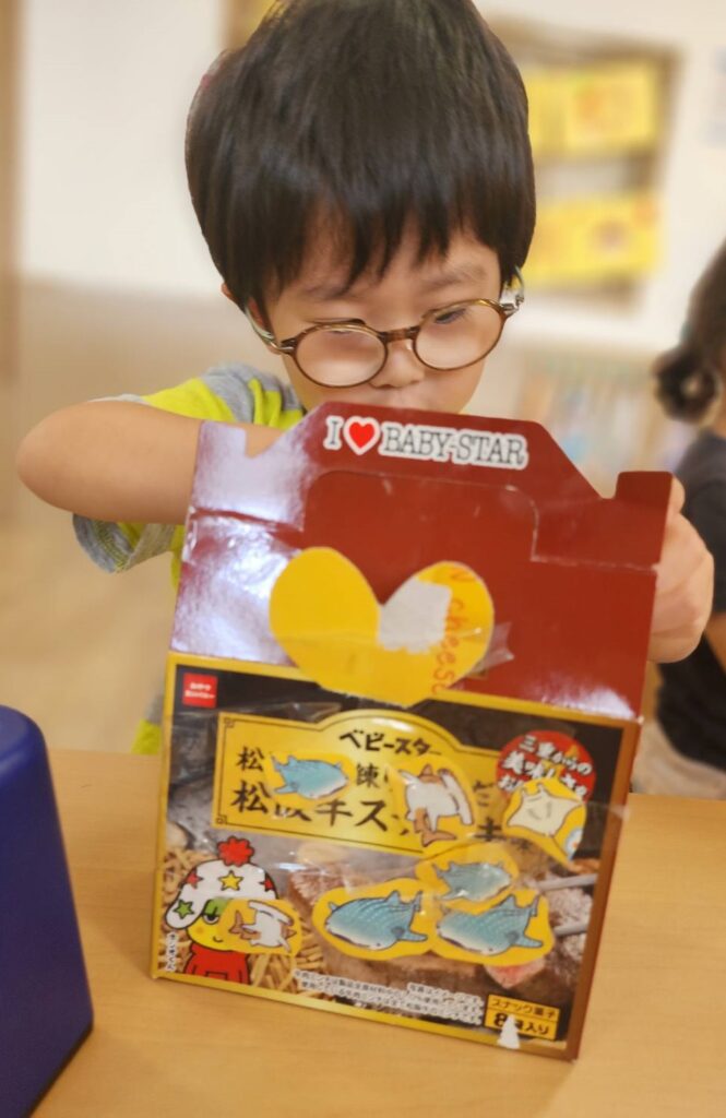 「出てくるところを作る!」と箱の側面に穴を開けたり、景品になる物を選んで作り上げることが出来ていました👏