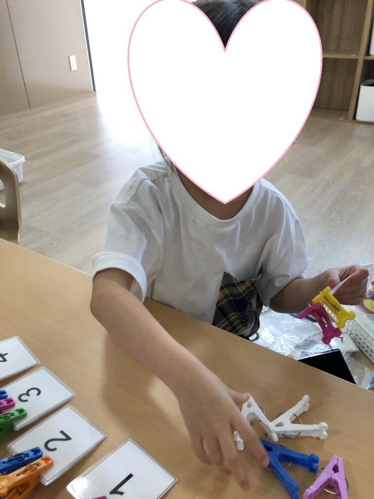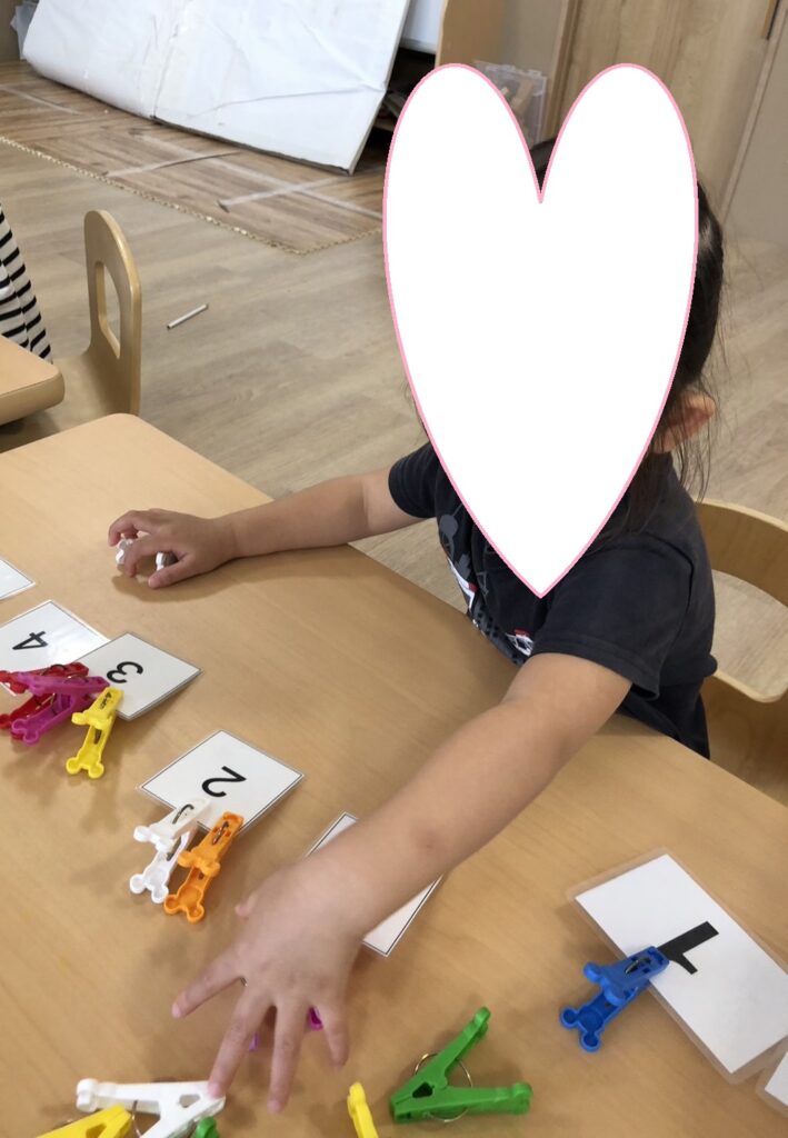 数字課題ではカードに描かれている数字の分だけ洗濯ばさみを付けていきます👆