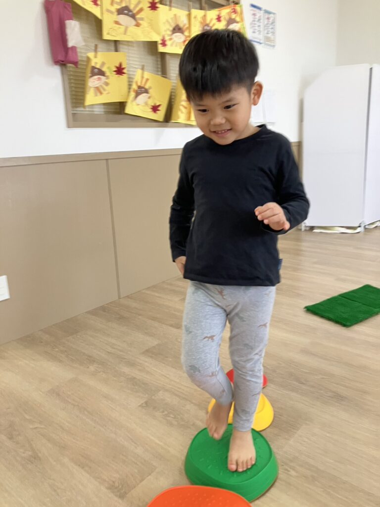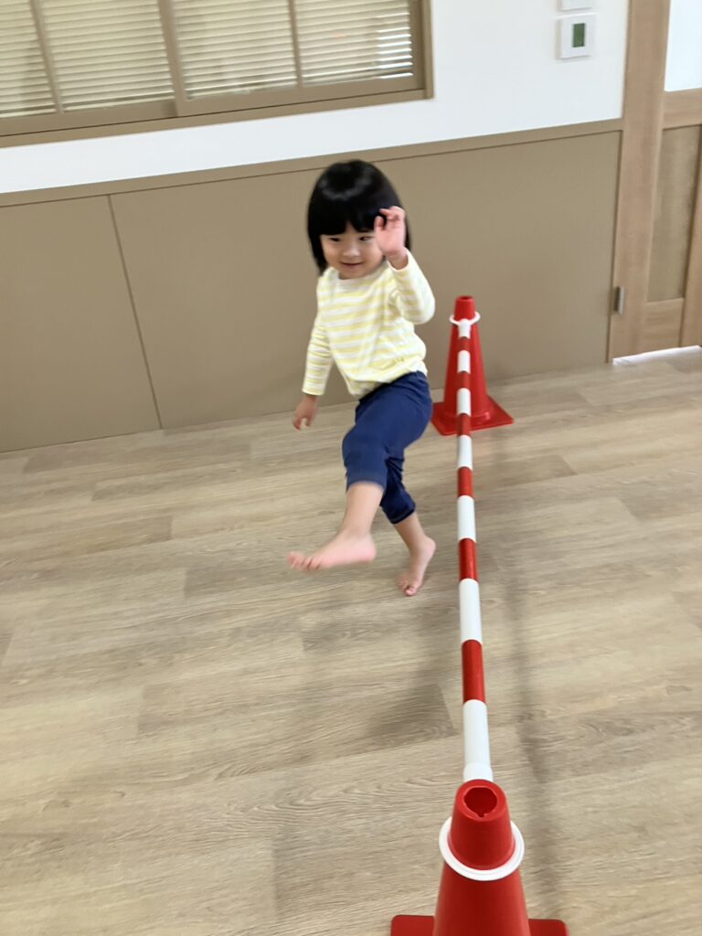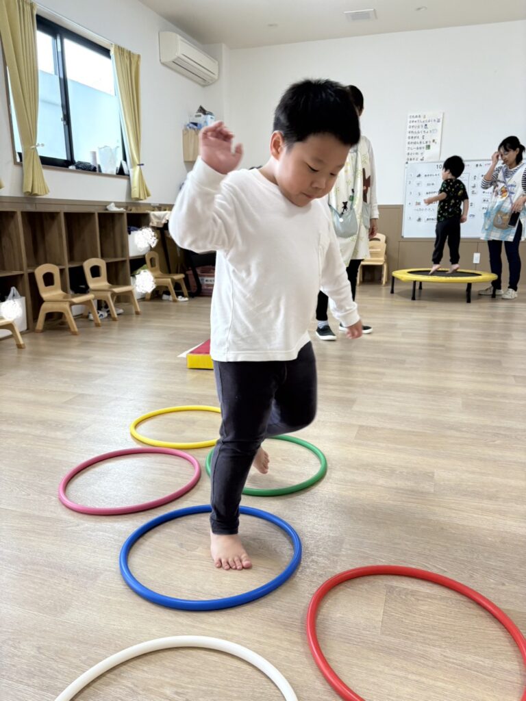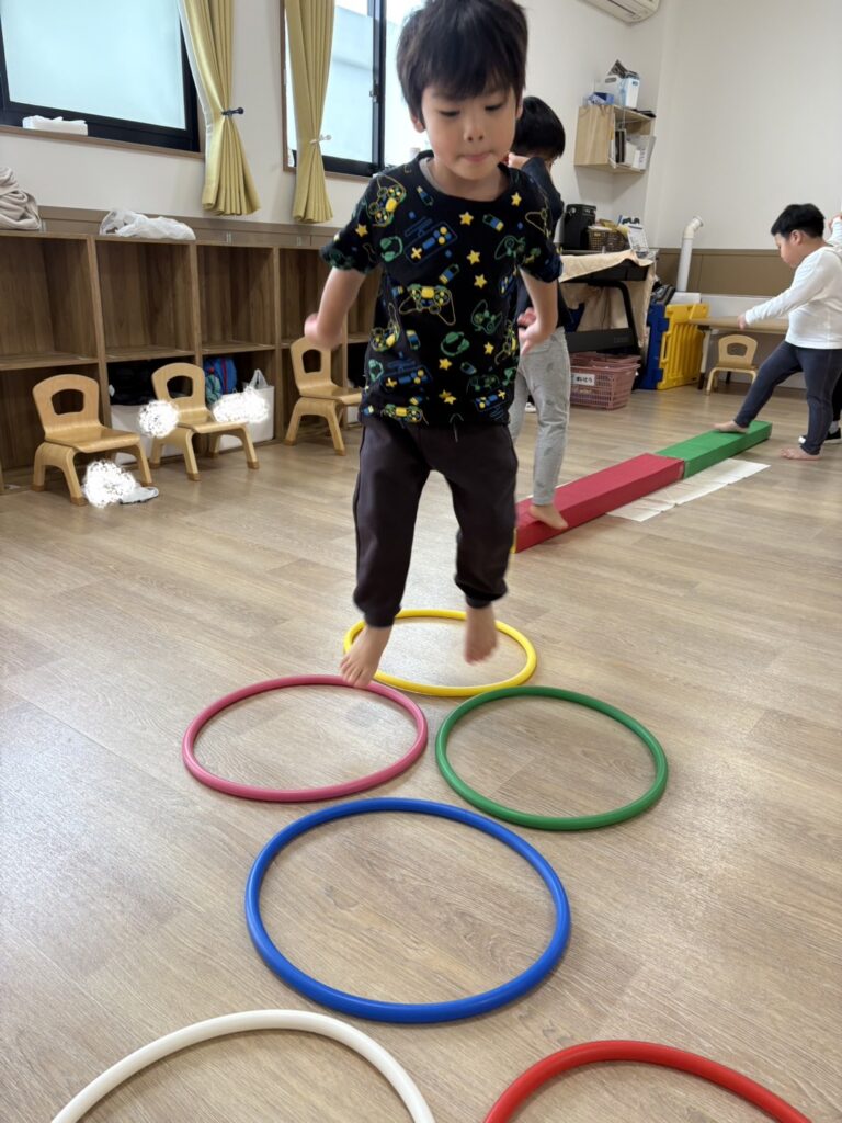 平均台、フープジャンプ、棒くぐり、飛び石、トランポリン