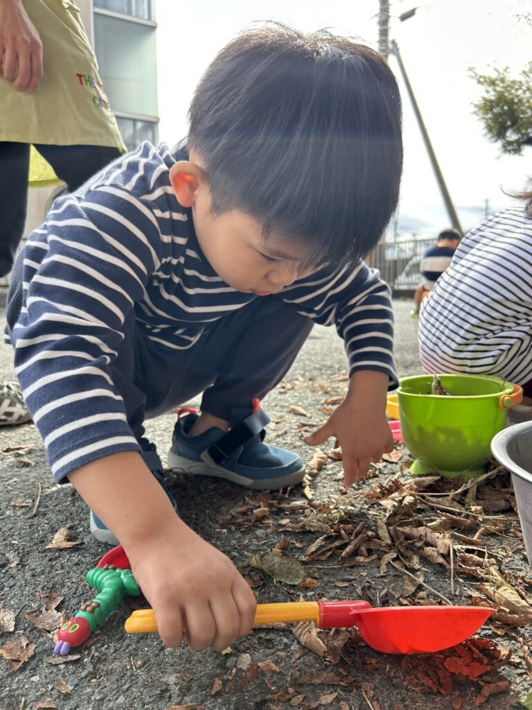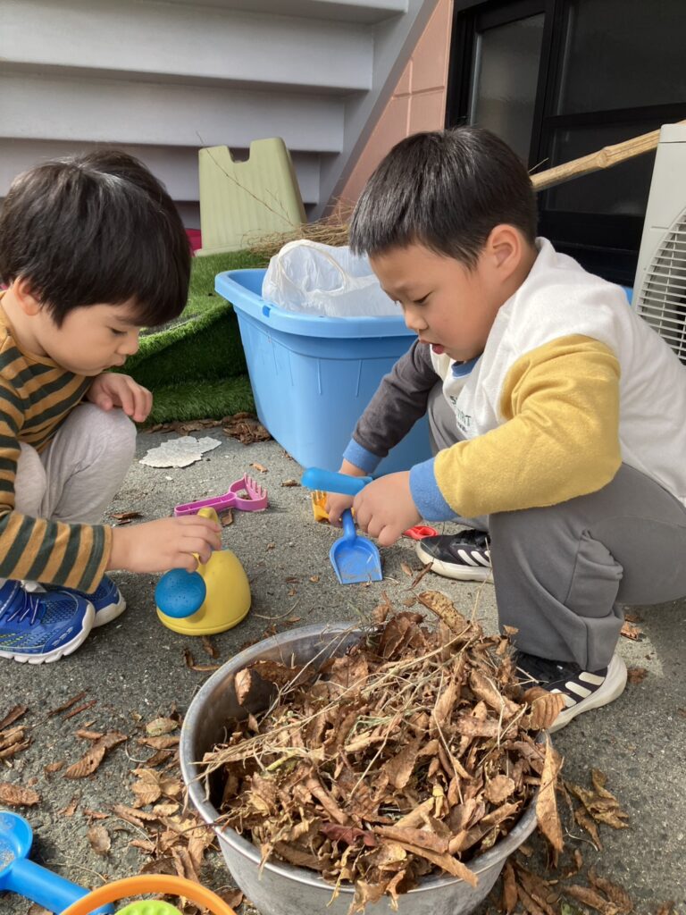 枯れ葉を集めておままごと🙌どんな音がするかな?どんな感触かな?