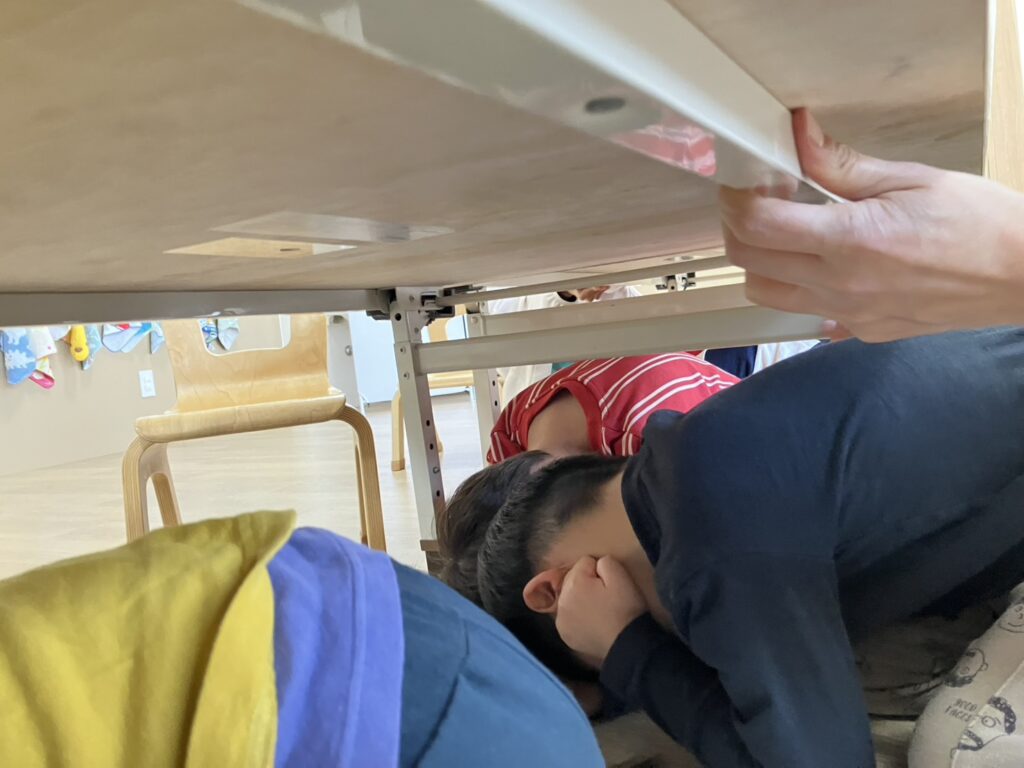 実際に地震の際に鳴るアラームを鳴らし、『だんごむし』の姿勢で机の下に入って身を守りました。
