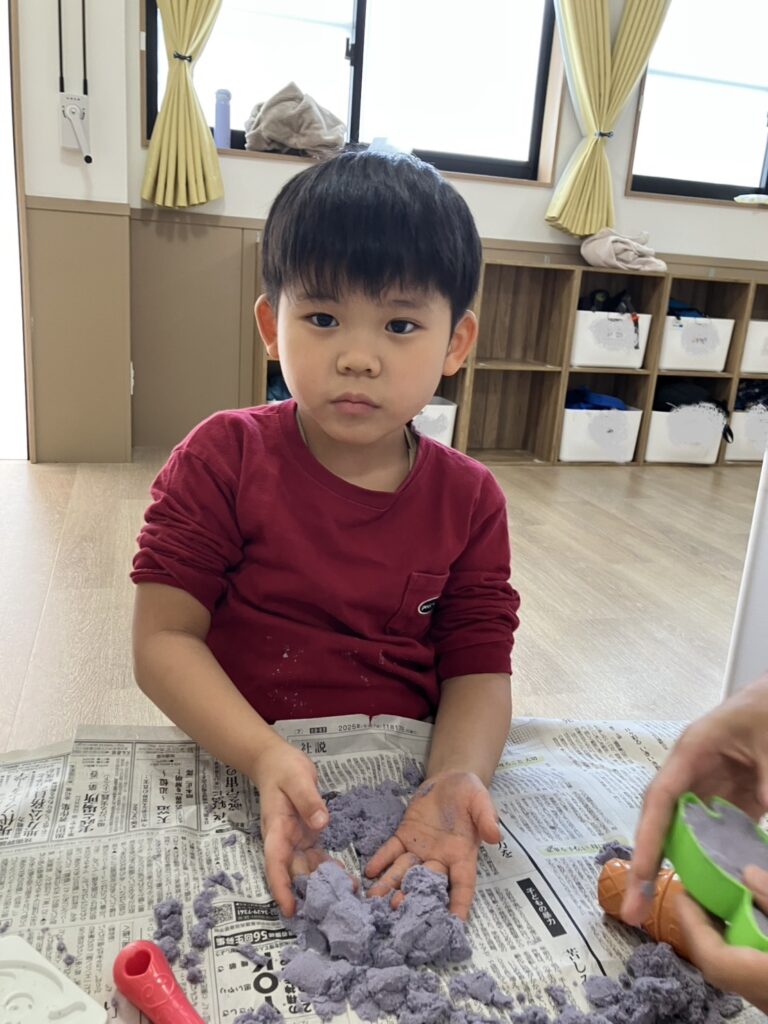 砂遊びでは、不思議な感触を楽しみながら捏ねたり、握ったり・・・✊🖐