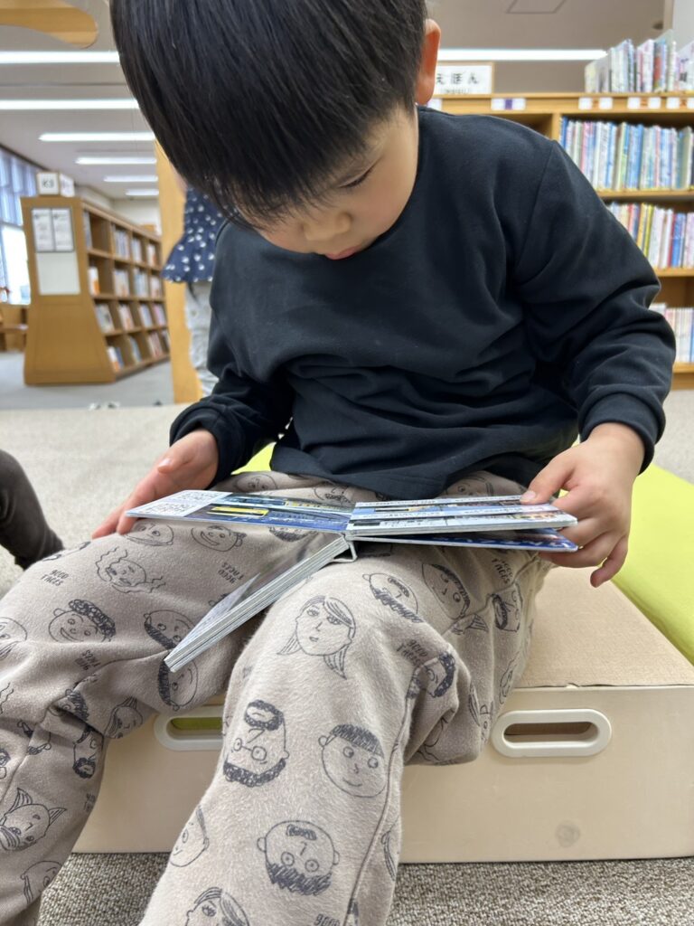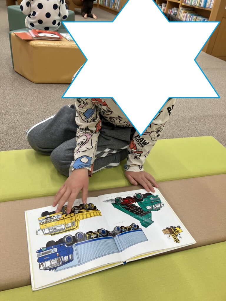 トーマスや車、恐竜などの本を何冊か出してじっくり絵を見つける利用児さん☺