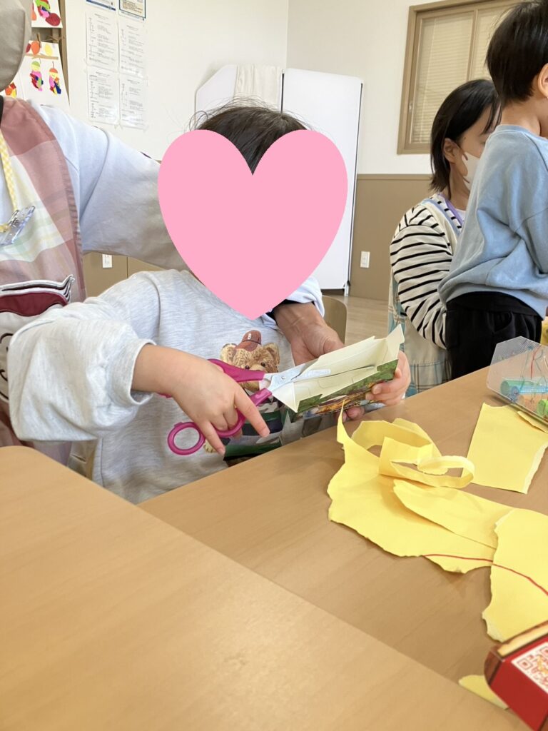 箱にテープを張っていた利用時さんに「つなげて電車にしてみたらどう?」と職員が言うと「いいね!」との利用児さん(^^♪