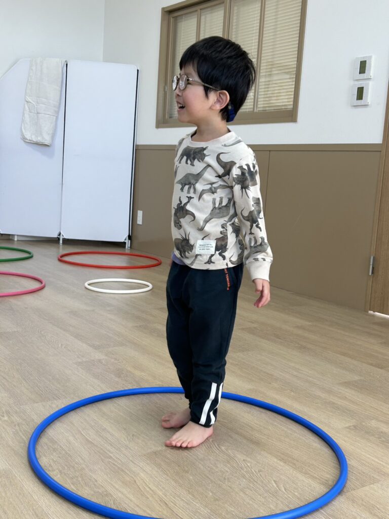 フープ色移動では「大きい赤」「小さい黄色」など職員が指定した色&大小を聞いて移動!!
