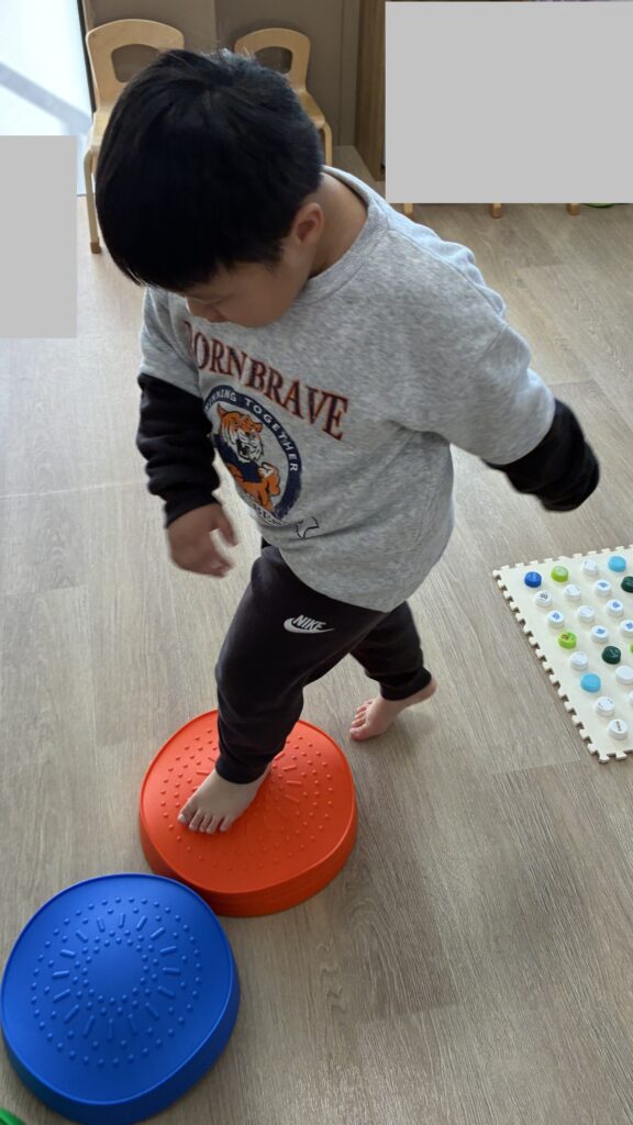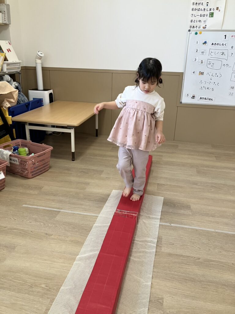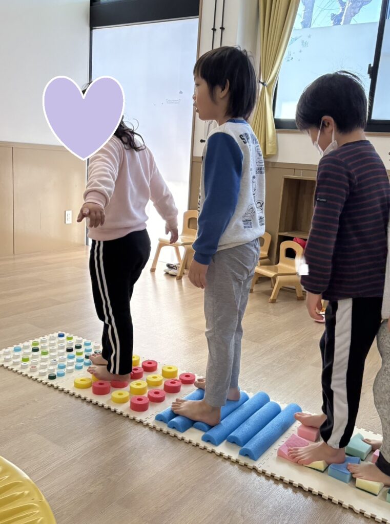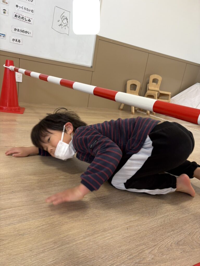 2つのグループに分かれて行いました。フラフープでケンケンをするのに、両足で交互に行っていた利用児さん。職員が正しいやり方を伝えると、見事片足でケンケンできるようになりました👏