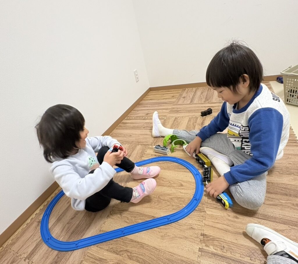レールをお友達と一緒につなげたり、順番に走らせることを楽しみました!