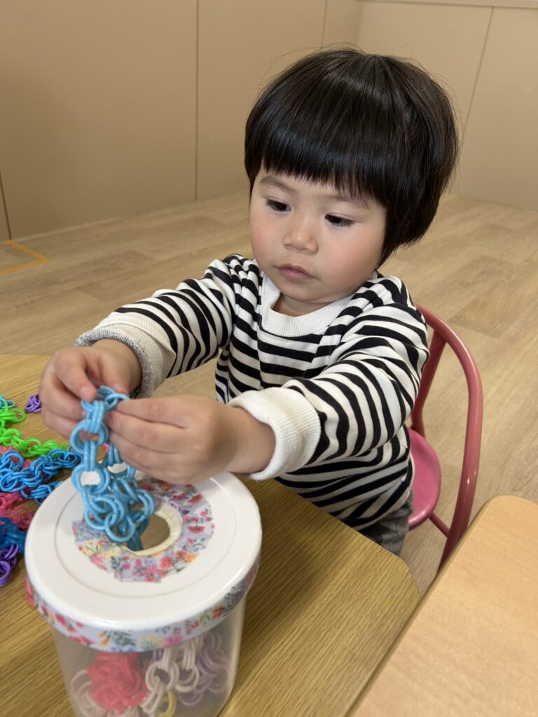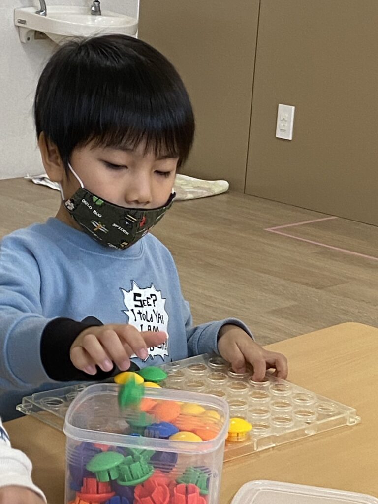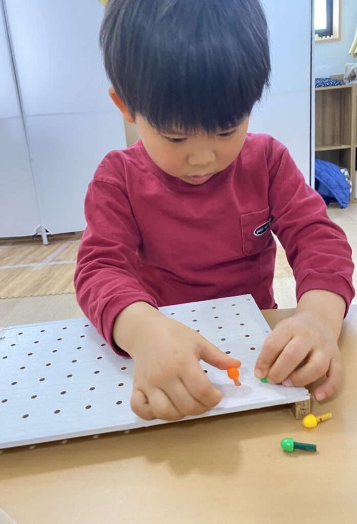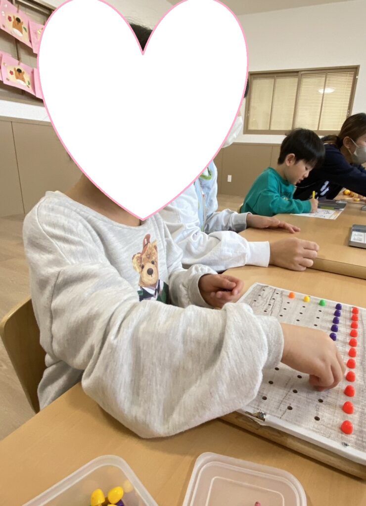 ペグやパズル、チェーリング落としなど、それぞれに合った課題を行いました☝
