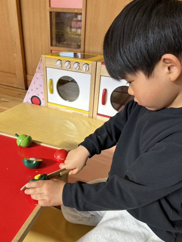 おままごとが好きな利用児さんは野菜や果物を自分で出して包丁でザクッと切ることを楽しんでいましたよ🍓🍎🥕