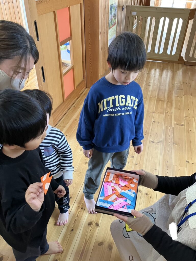 帰る前、にこりんの職員さんから「今日は節分だから鬼の折り紙をどうぞ☺️」と言って頂き、一人一人好きな色の鬼を選びました。