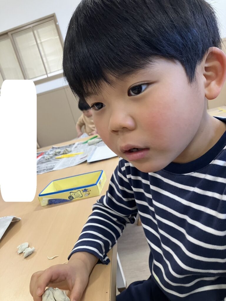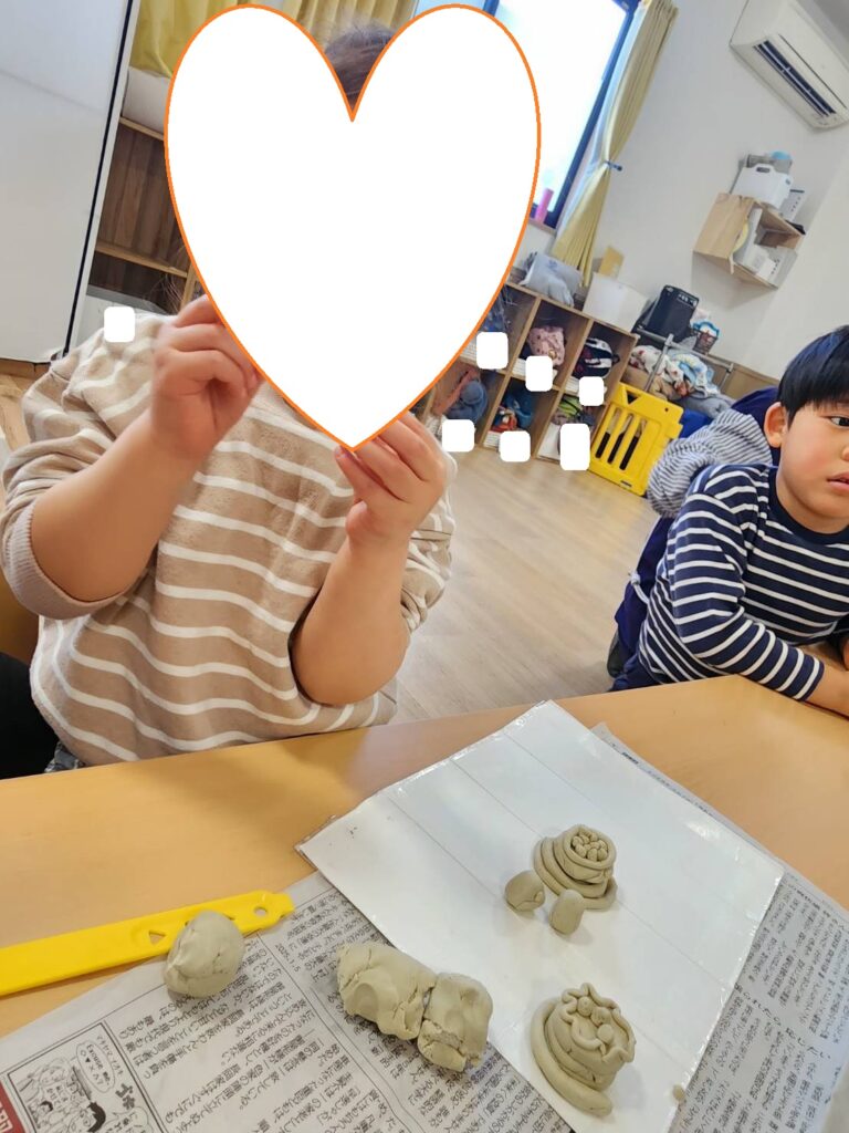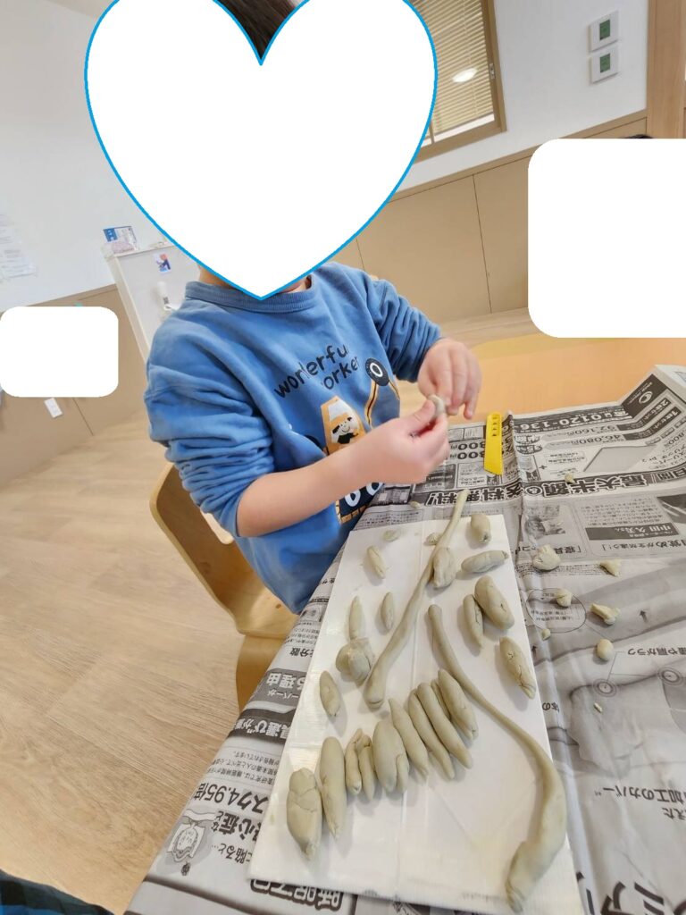 雪だるまをたくさん作って並べていた子や、職員と一緒においしそうなケーキを作っていた子、指先や手のひらを使ってこねたりちぎったりして粘土の感触を楽しみました✋