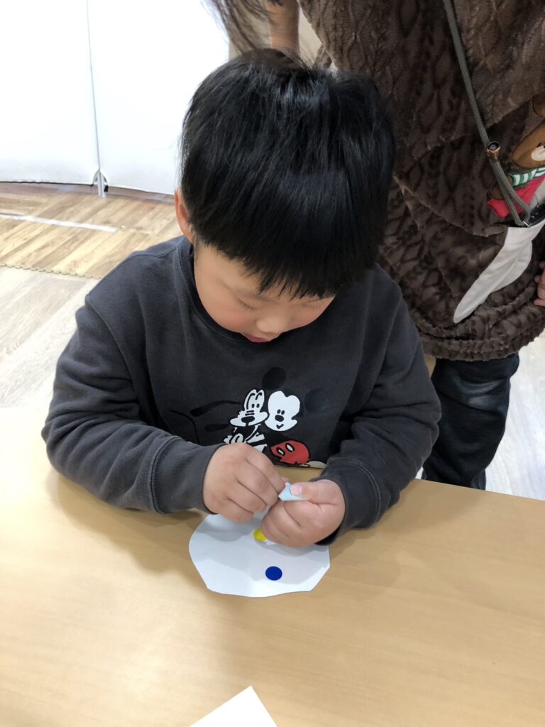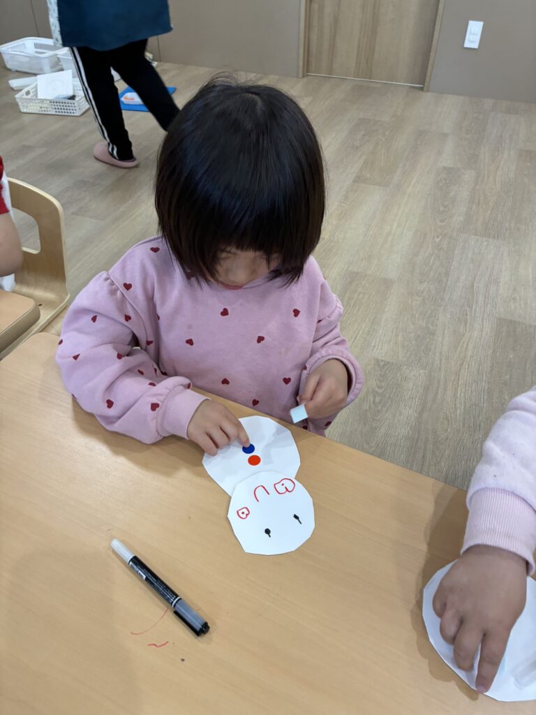 まずは雪だるまの目と口をペンで描き、カラーシールを貼ってボタンを表現!