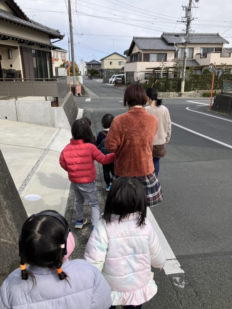 年長児さんは通学をイメージし、リュックサック🎒を背負って歩きました😊