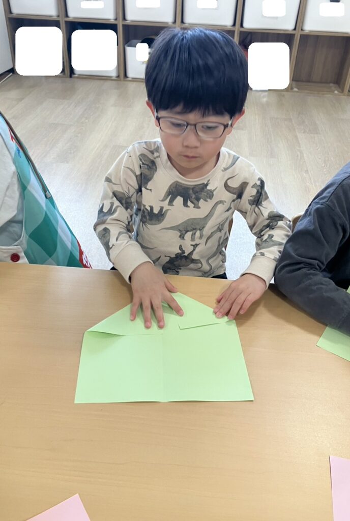 半分に折るよ!三角に折るよ!と作り方を聞き、見本を見ながら進めていきました☝
