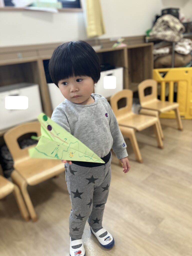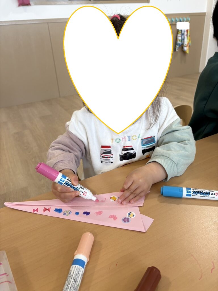 その後はシールを貼ったり、ハートや丸などの模様を描いたり、自分だけの飛行機づくりを楽しみました⭐
