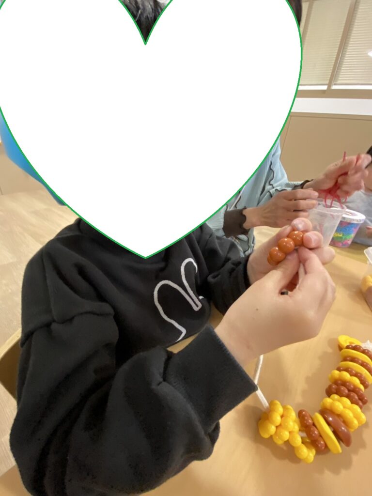 ビーズ紐通しやドーナツ紐通しを行った子達、たくさんのパーツを通すことができましたよ♪