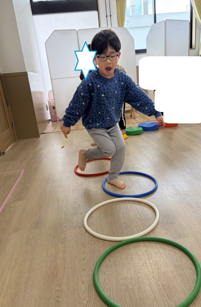 平均台、フープジャンプ、センサリーマット、棒またぎ/くぐり、鉄棒