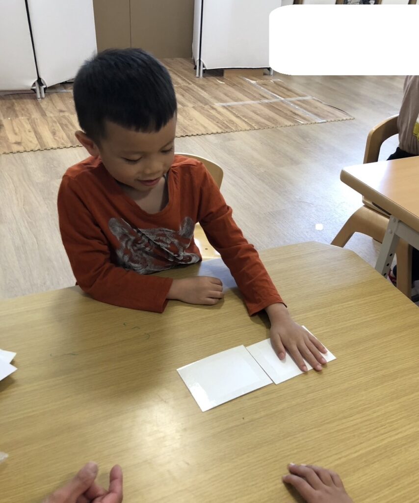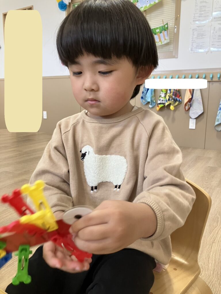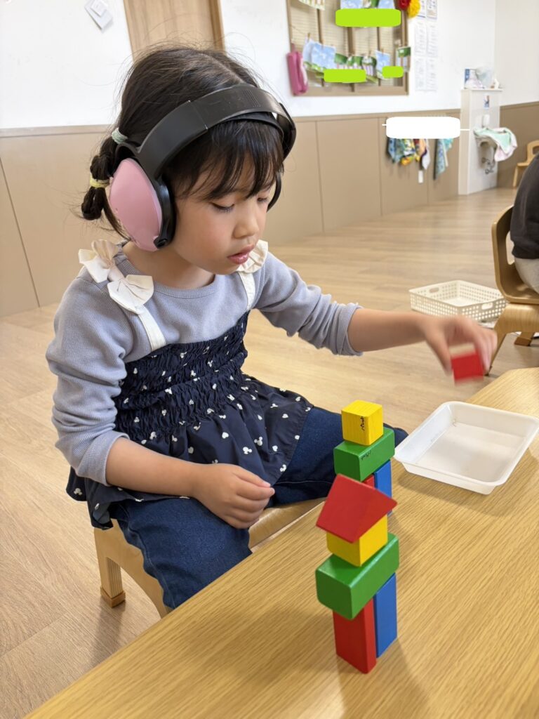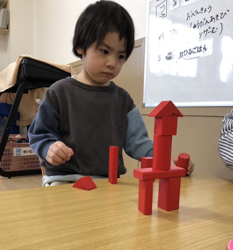 積み木模倣では色や形を言いながら一つ一つ丁寧に確認しながら作っている様子も見られました✌