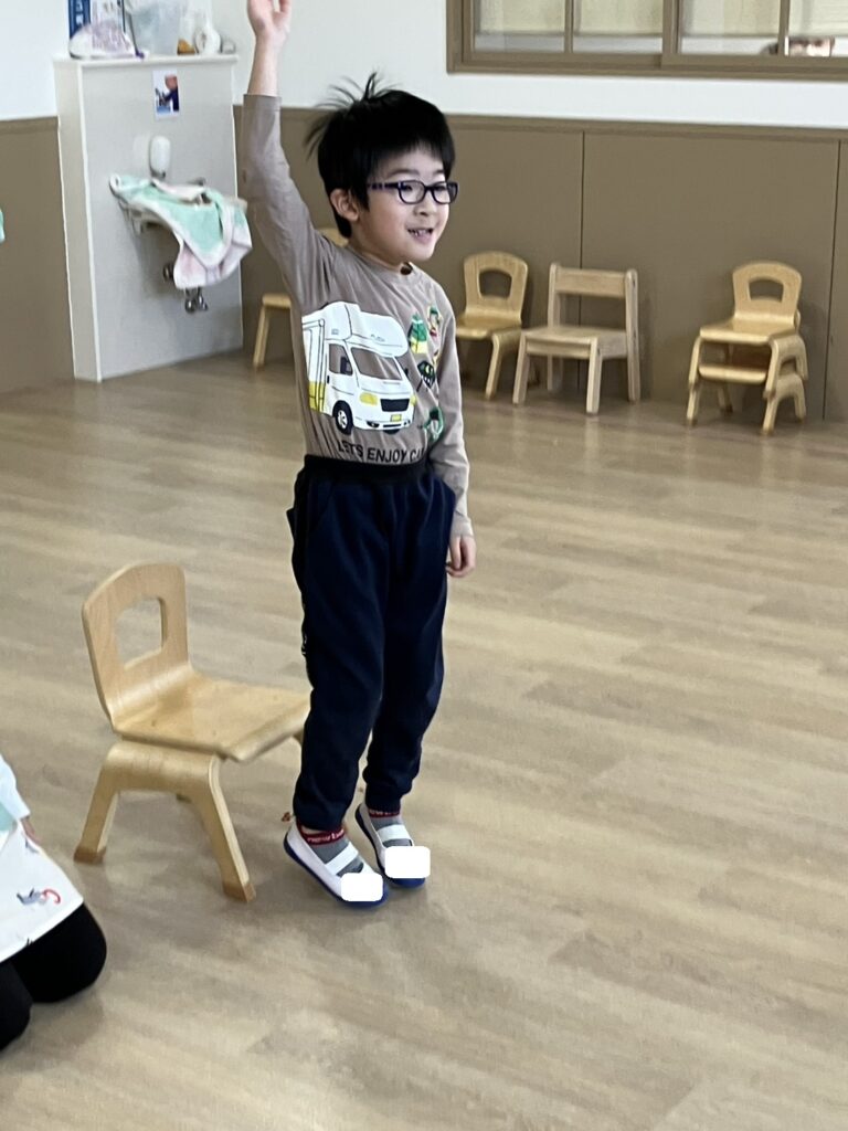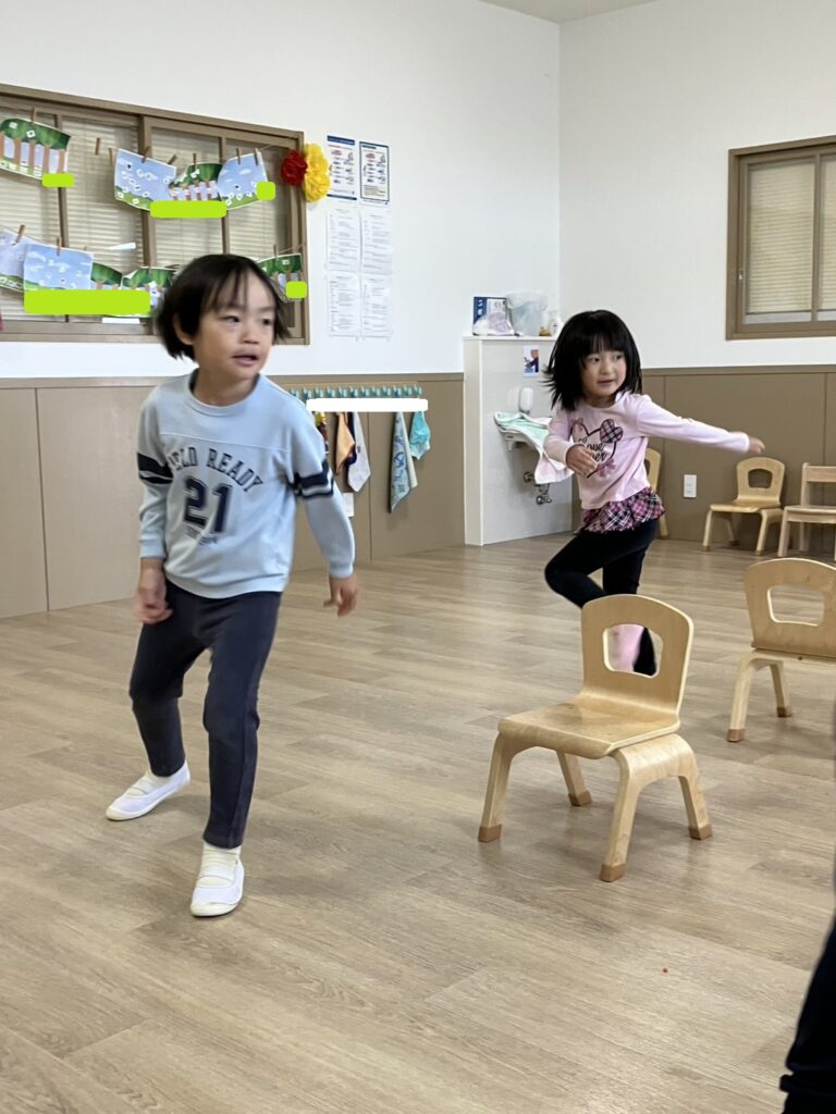 音をよく聞いて、音楽が止まると空いている椅子に座ります☺