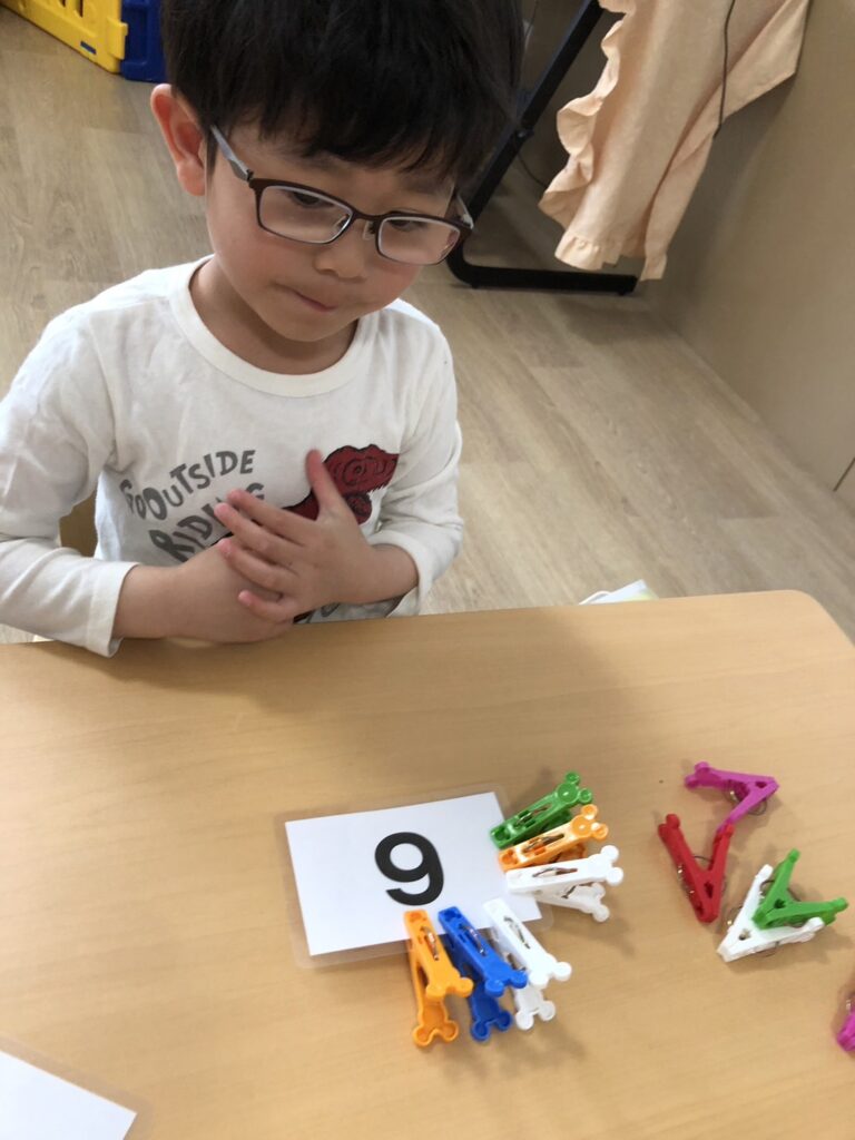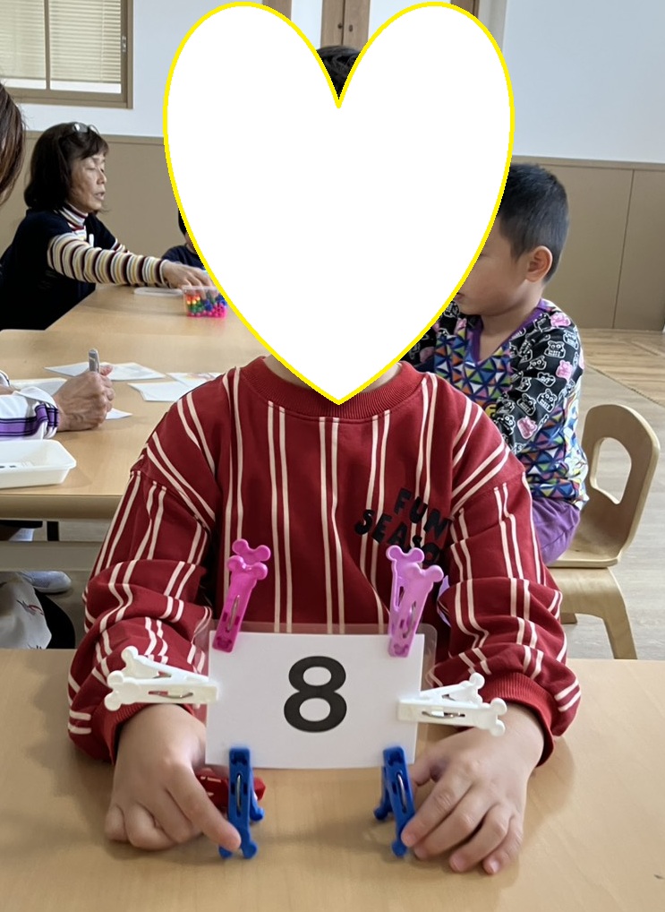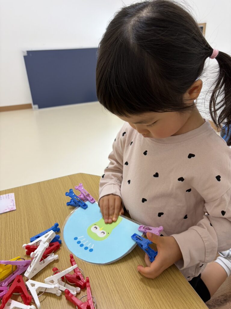 数字カードと洗濯ばさみを使って『数の概念』を確認していったグループでは、最初洗濯ばさみをつけることに集中して数を忘れてしまう様子も😮