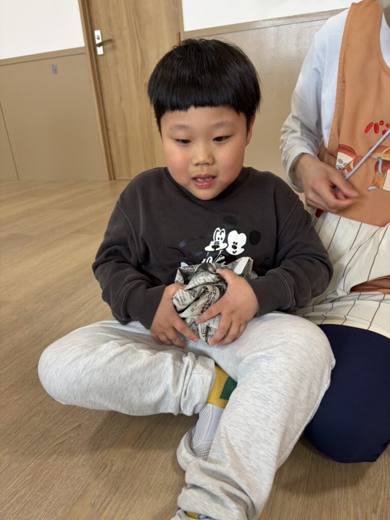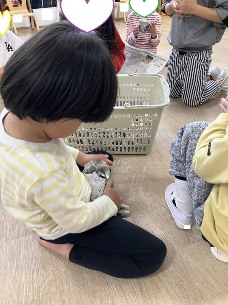 新聞紙をやぶることは上手になってきた利用児さん達。今回は、新聞紙を丸める練習をしました!