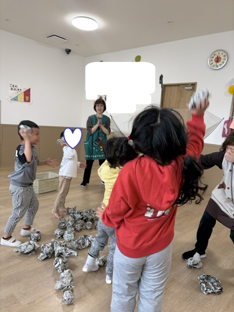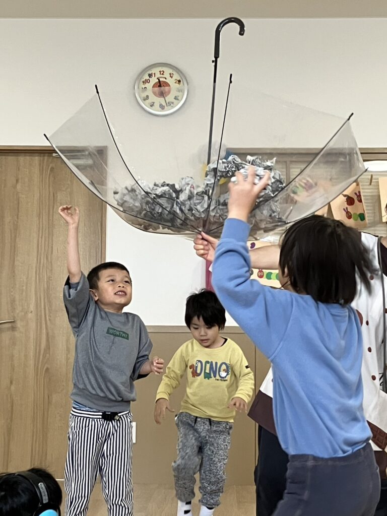 次にみんなで作った新聞紙ボールで、傘を使って玉入れをしました!